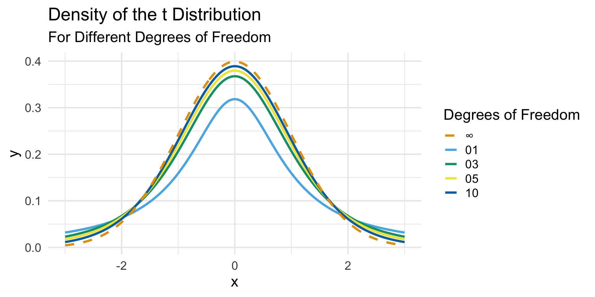 Given an i.i.d. sample (Y1, …, Yn) from a distribution with finite mean µ and finite variance σ2, \[ \frac{\sqrt{n}(\overline{Y}_n - \mu)}{S_n} \stackrel{\cdot}{\sim} t_{n - 1} \] where \(S_n := \sqrt{(n - 1)^{-1} \sum_{i=1}^{n} (Y_i - \overline{Y}_n)^2}\) and \(t_{n - 1}\) denotes the t-distribution with ν degrees of freedom.