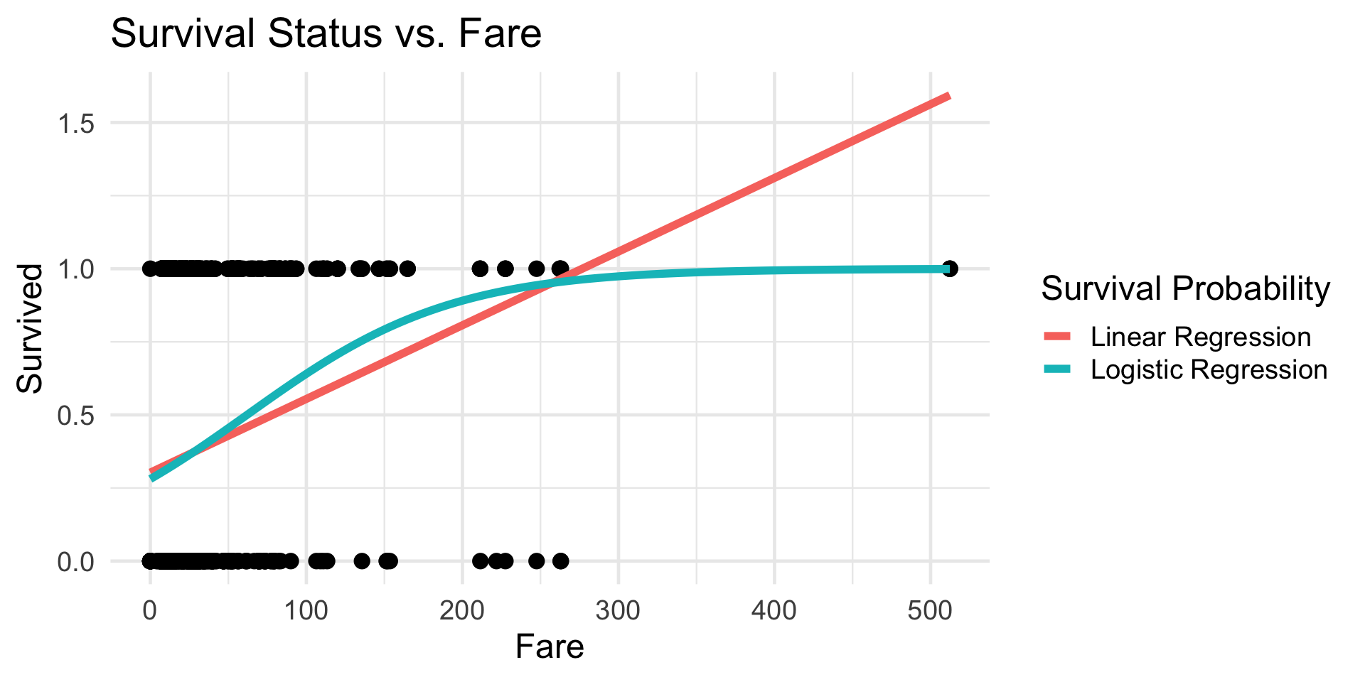ggtitle("Survival Status vs. Fare")\[\begin{align*} \pi_i & = \Lambda\left( \beta_0 + \sum_{j=1}^{p} \beta_j x_{ij} \right) = \frac{1}{1 - e^{-\left(\beta_0 + \sum_{j=1}^{p} \beta_j x_{ij} \right)}} \\ \mathrm{logit}(\pi_i) & = \beta_0 + \sum_{j=1}^{p} \beta_j x_{ij} \end{align*}\]