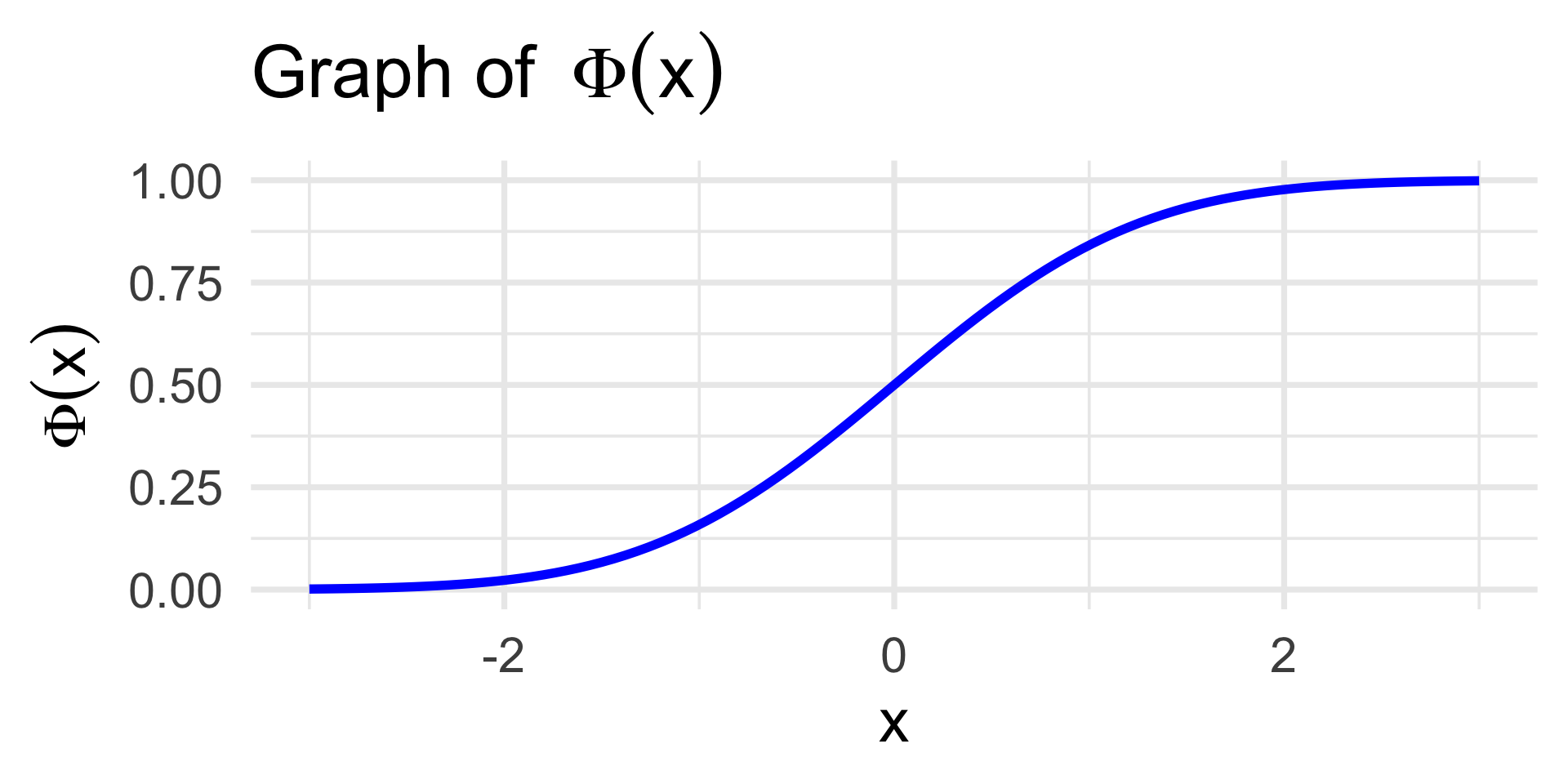 \[ \Phi(x) := \int_{-\infty}^{x} \frac{1}{\sqrt{2\pi}} e^{-z^2 / 2} \ \mathrm{d}z \]