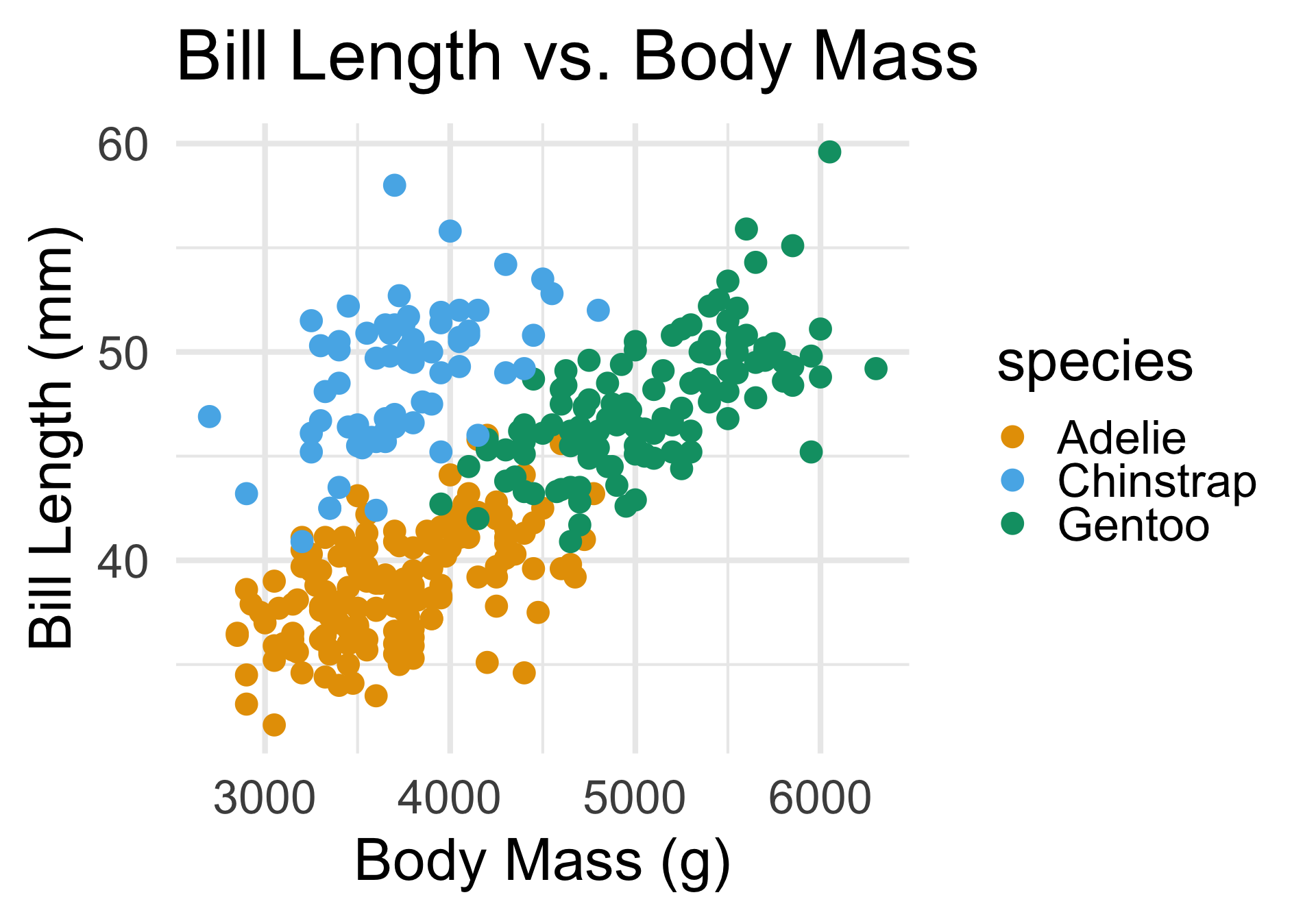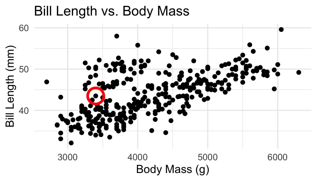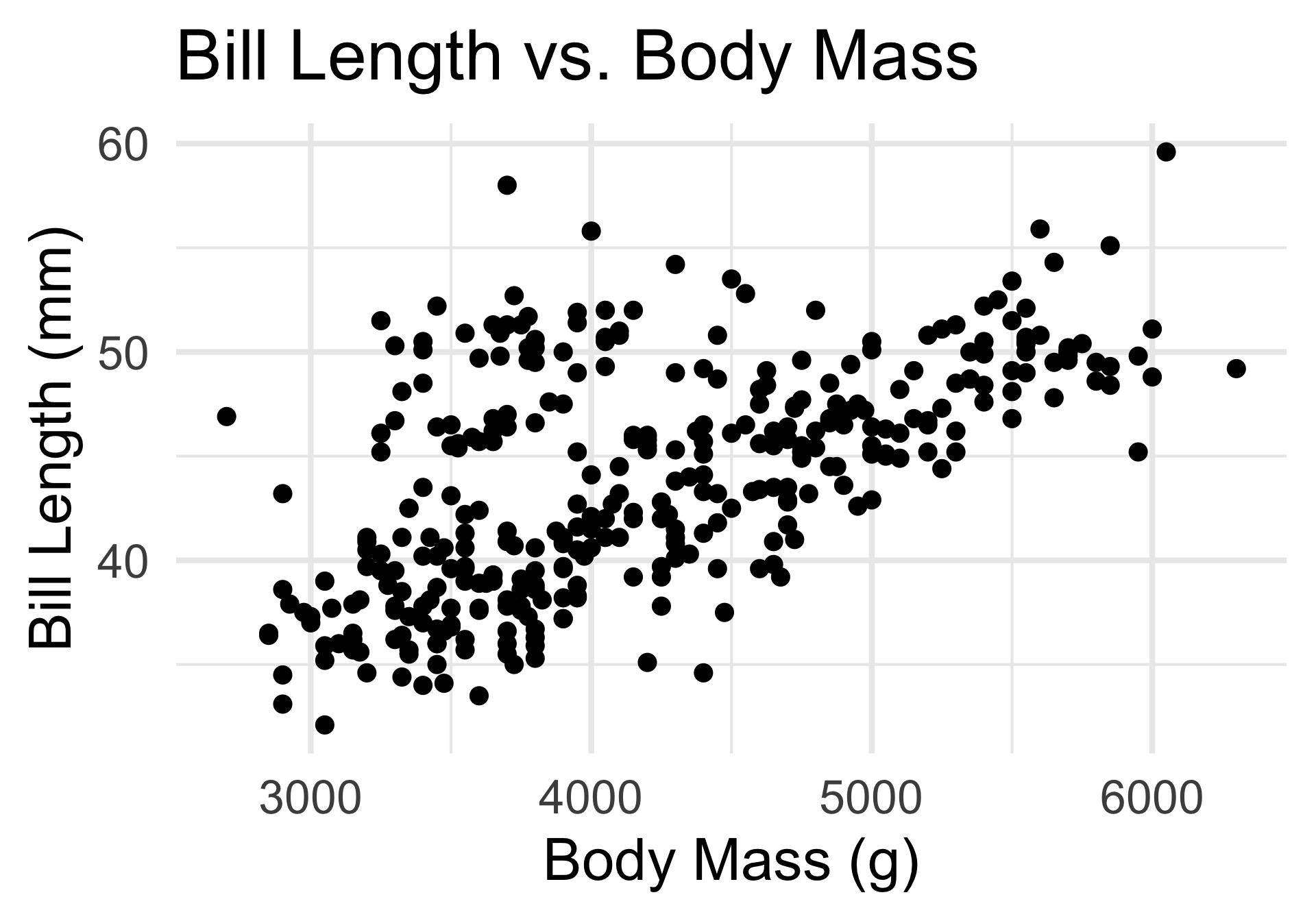 As an example, consider the following scatterplot of penguins Bill Lengths plotted against their Body Mass: